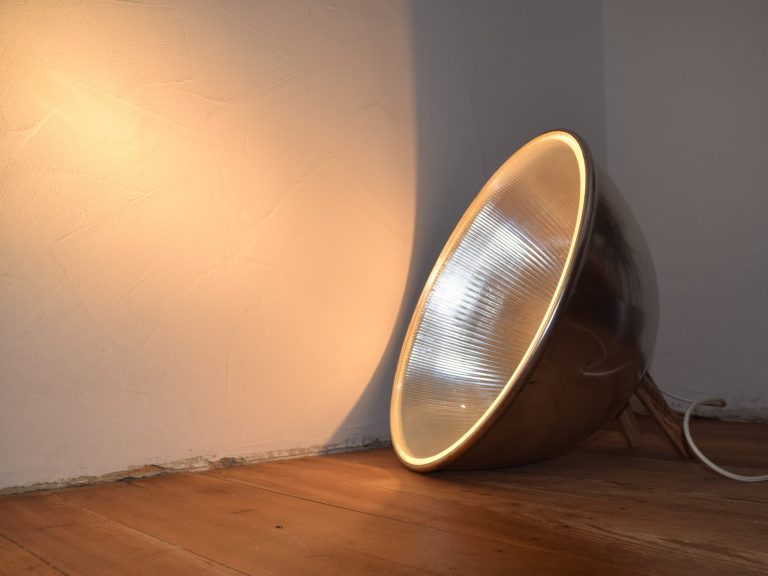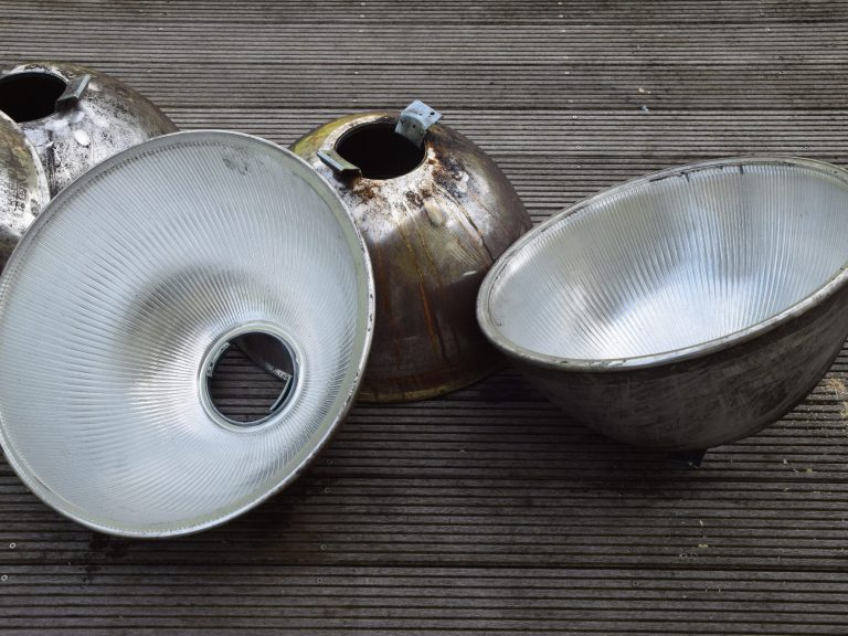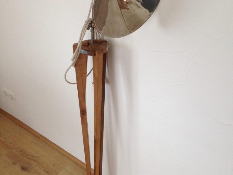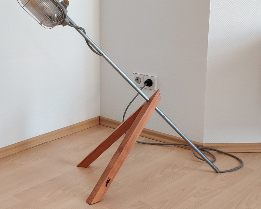 Die von einer Gießerei ausrangierten Lampenschirme sind dabei das Herzstück jeder Leuchte. Zusätzlich wurdenHolzreste und Teile einer kaputten Stehleuchte verwertet.