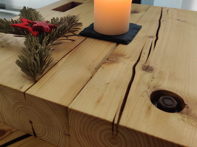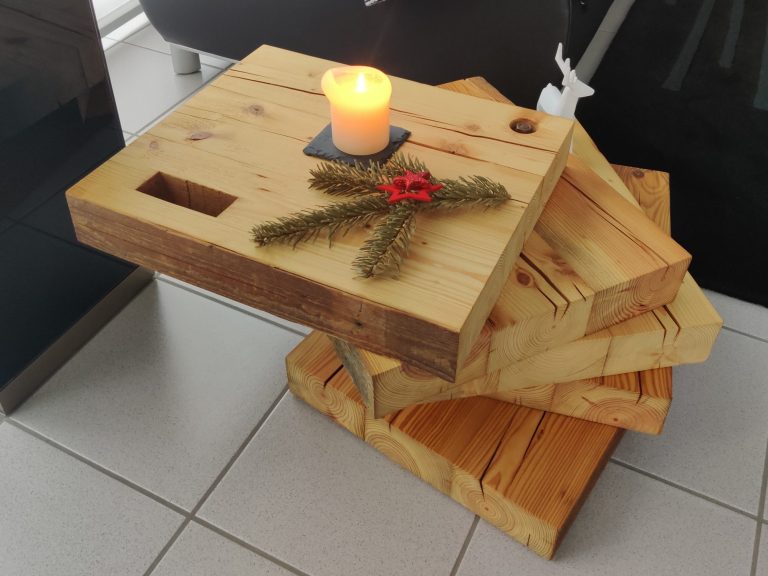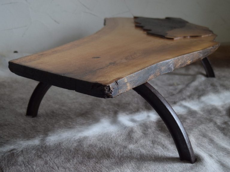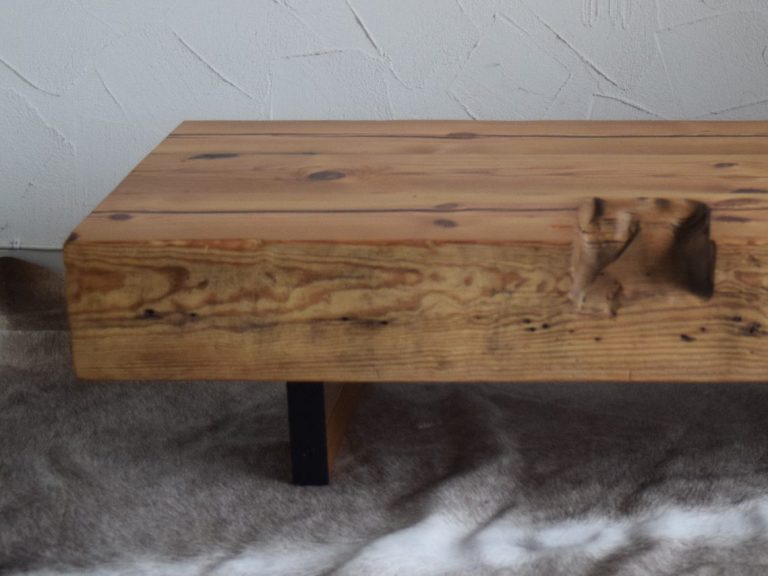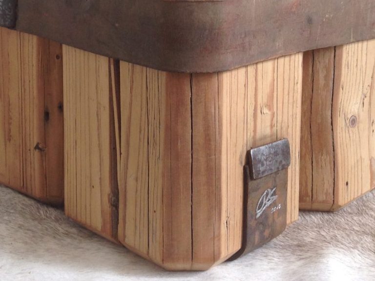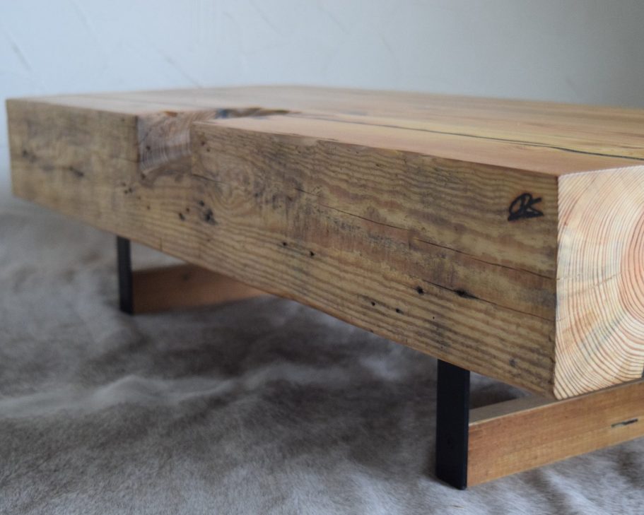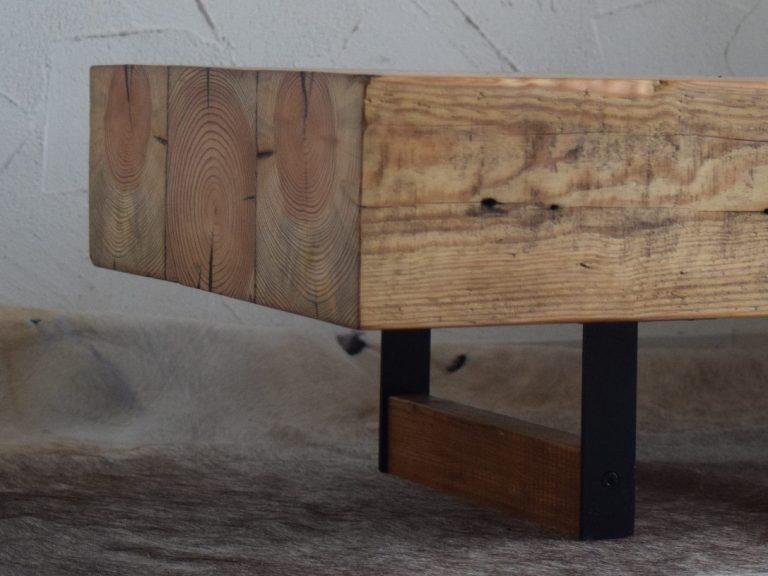 Ein massiver Tisch, gerfertigt aus Dachsparren eines Bauernhauses und Alteisen aus der Landwirtschaft.