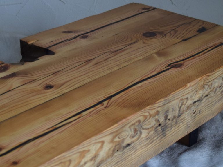 Über viele Jahre haben diese Balken die Lasten eines Kornspeichers getragen. Originale Kanten, Risse und eine Holzverbindung verleihen dem Tisch seinen ganz besonderen Charme.