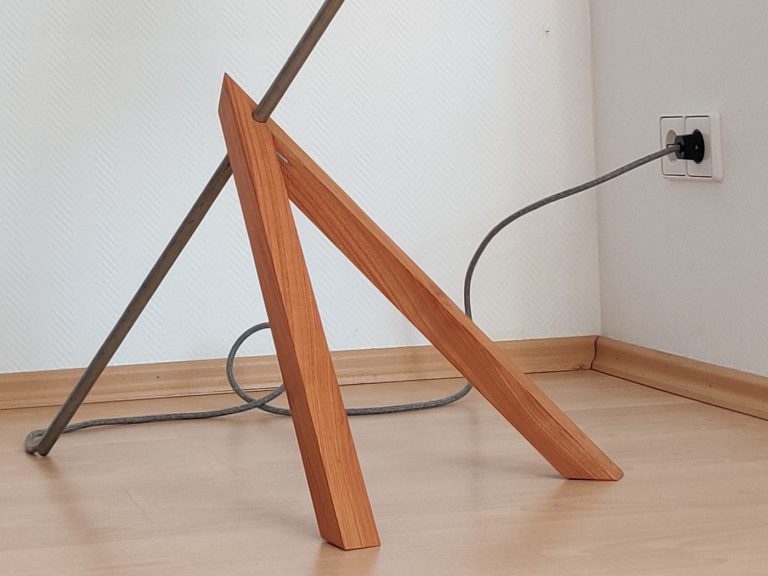 Beine aus Kirschholz und ein Textilkabel verleihen der Leuchte Wärme und Wertigkeit.