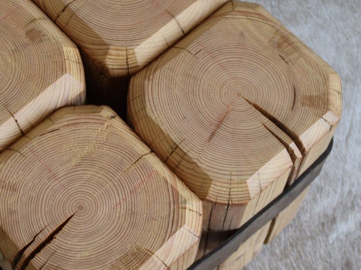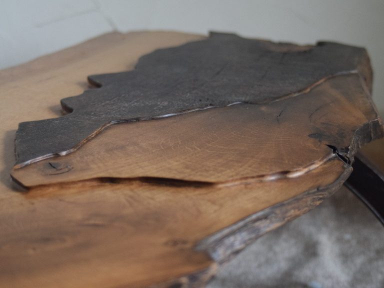 Eichenholz, gezeichnet von Feuer, Zeit und Bearbeitung.