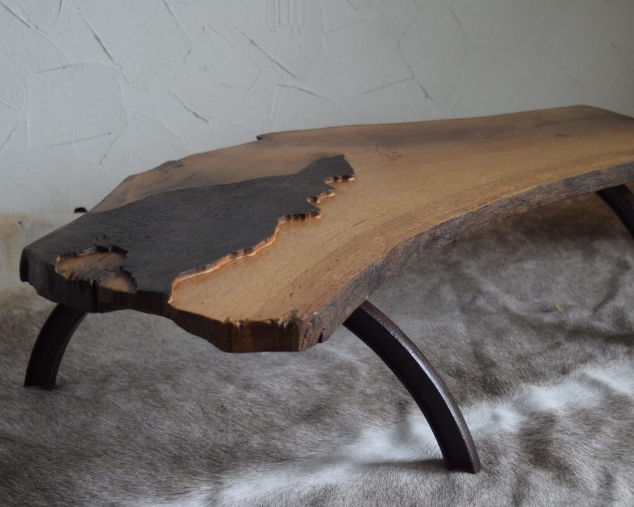 Die natürliche Form und die unterschiedlichen Texturen prägen den eigenständigen Charakter des Tisches. Getragen wird die massive Platte von zwei Bögen aus ehemaligen Fassringen – rostig, aufgearbeitet und bewusst in Szene gesetzt.