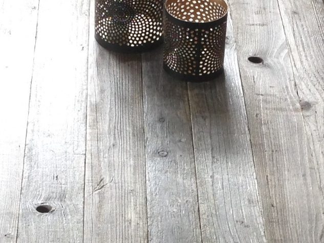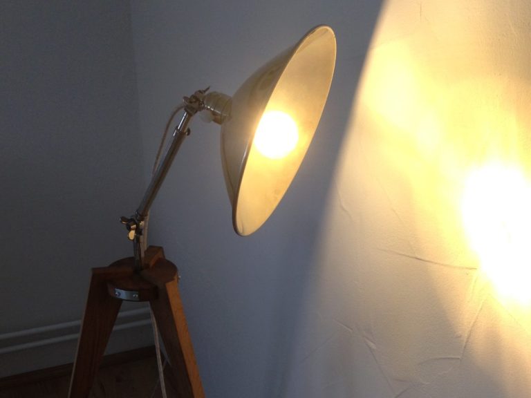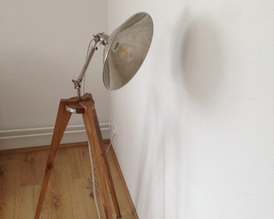 Für diese elegante Stehleuchte wurden Eichenbretter und Lampenteile wiederverwendet. Das Holz und die frühere Wärmelampe stammen aus einem alten Stall und einer Scheunenruine.