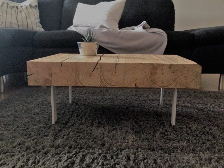 Wiederverwendetes Holz veredelt und vereint mit filigranen Metallfüßen, weiß lackiert.